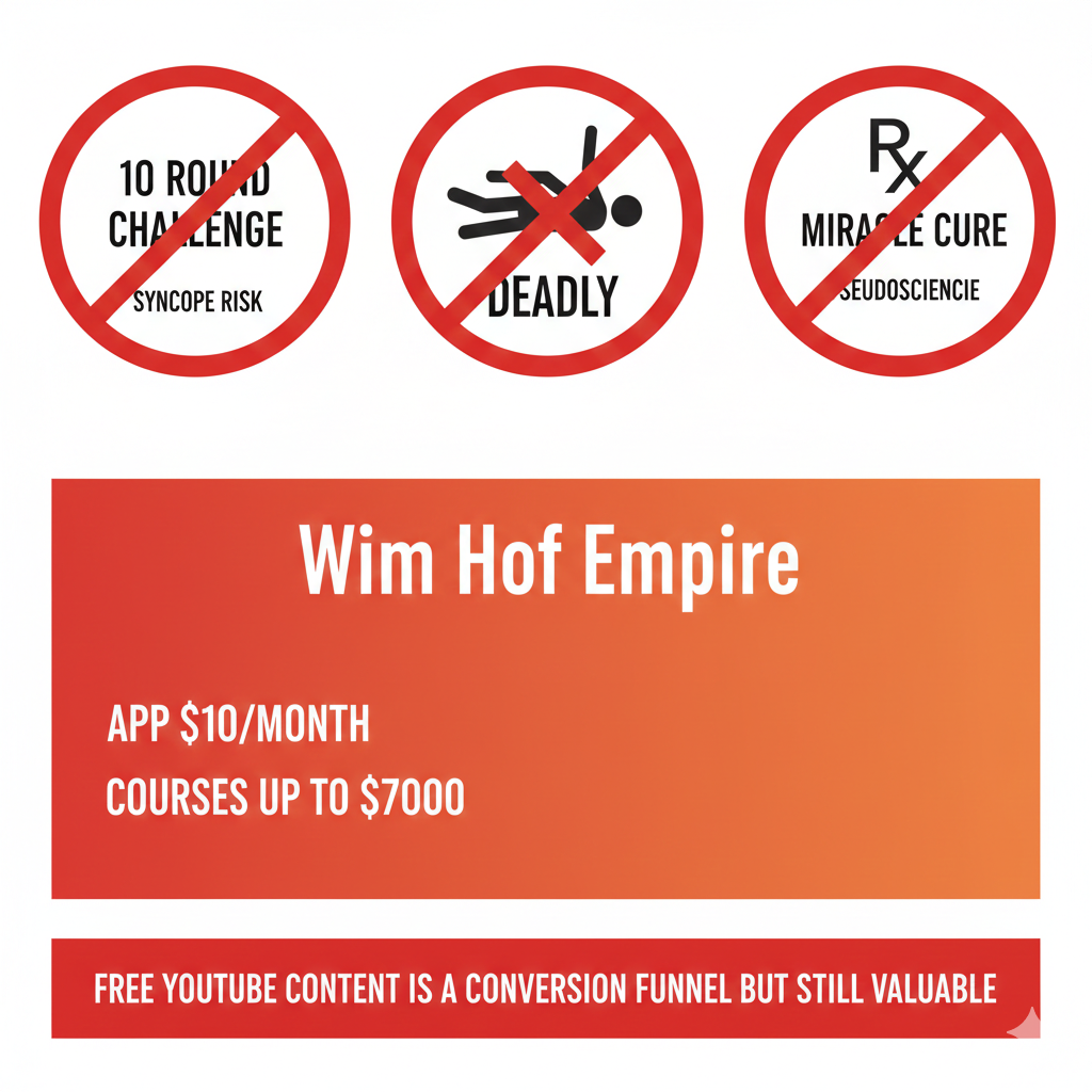 Red flags to avoid: "10 rounds challenge" (syncope risk), underwater practice (DEADLY), disease cure claims (pseudoscience). The Wim Hof empire: app $10/month, courses up to $7000—free YouTube content is a conversion funnel but still valuable